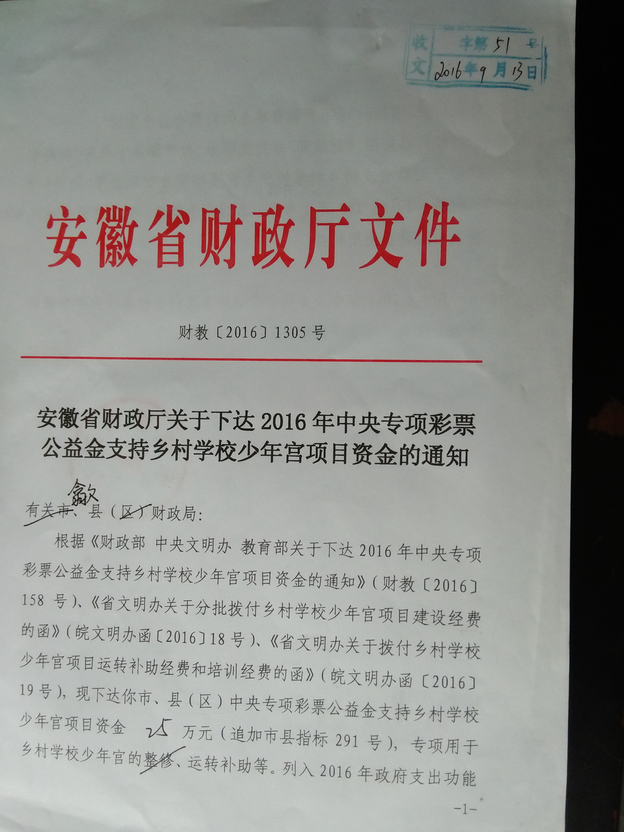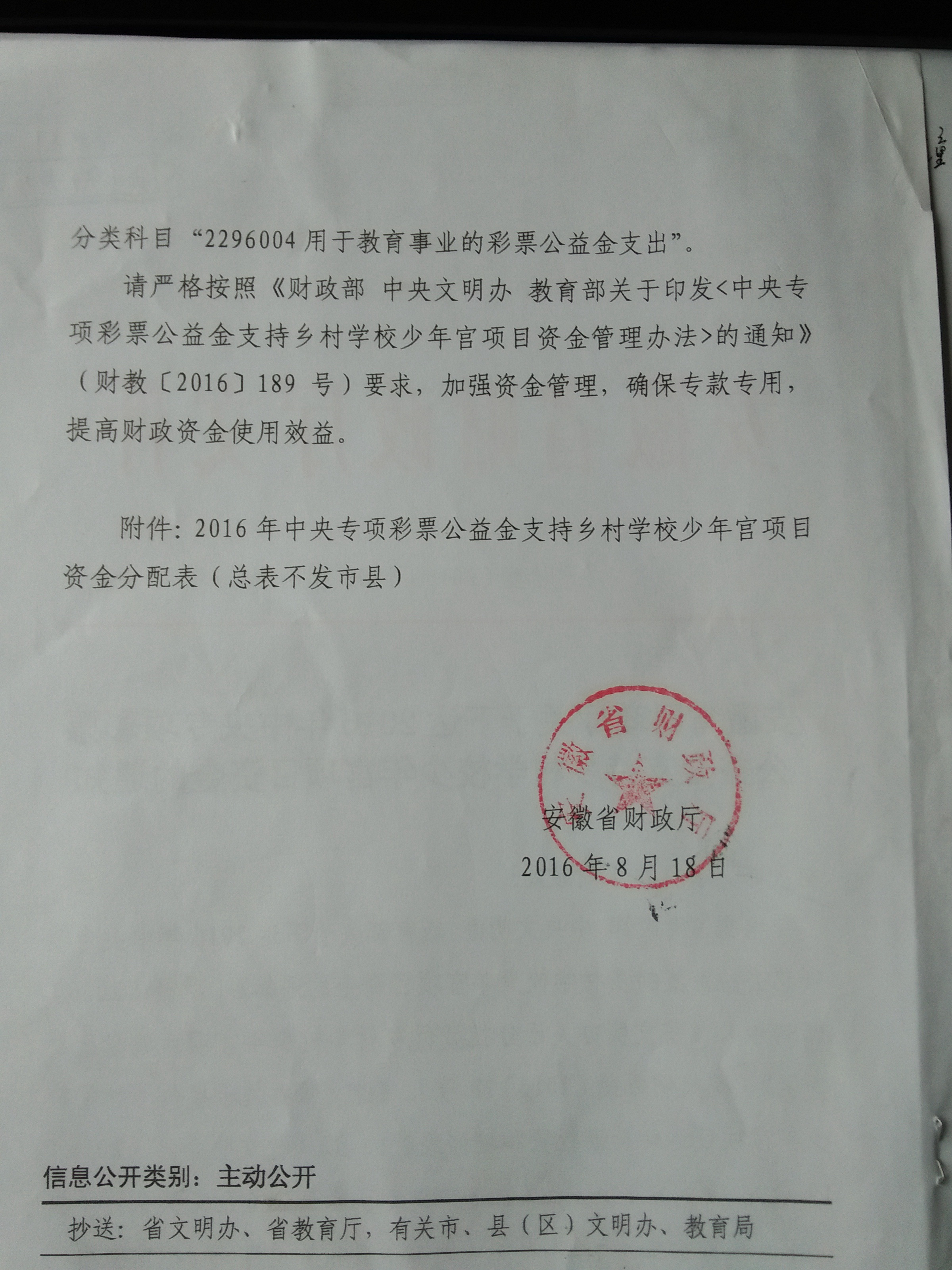 安徽省财政厅关于下达2016年中央专项彩票公益金支持乡村少年宫项目资金的通知