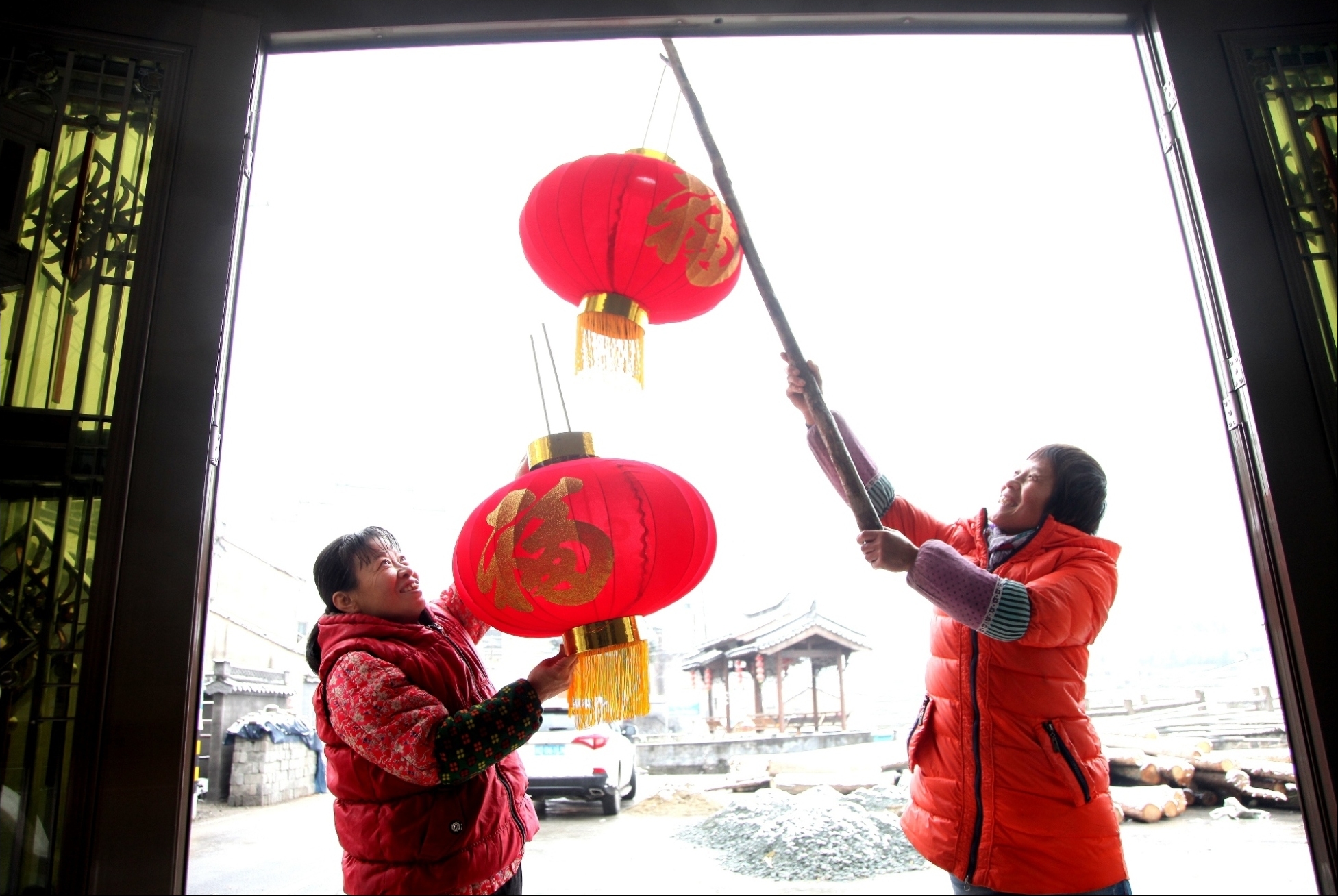 1月31日,石门乡石门村党员志愿者项秀莲(右)帮助贫困户朱美娟在家门口挂起“福”字红灯笼。