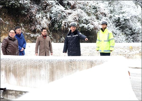 1月31日,王村交警中队民警与石门乡干部在竹岭村路桥上检查冰雪道路安全。