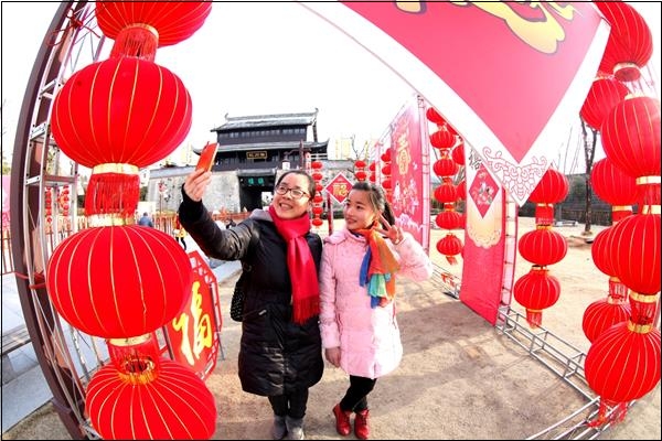 2月4日,歙县徽城镇府衙广场,市民在刚悬挂的灯笼前拍照留影。