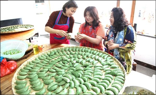 4月1日,桂林镇金坑村一亩山庄“徽姑娘”王海英(左一)教北京游客制作“清明饺”。