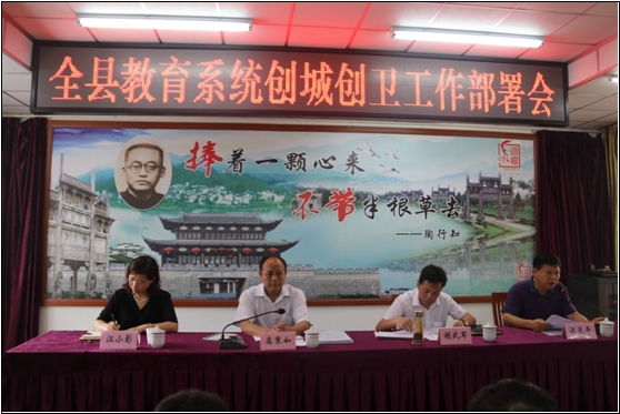 为积极争创全国文明城市和省级卫生县城,县教育局于5月25日下午召开创城、创卫工作部署会。县人大常委会主任、创城指挥部政委高秉如,市文明办副主任胡武军,县委宣传部副部长、县文明主任江小影出席会议,县教育局党委书记、局长汪天平主持会议。各学校、幼儿园、陶馆、青少年校外活动中心主要负责人和经办人,县教育局各股室负责人和联络员,共计150余人参加会议。