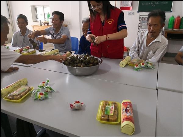 志愿者一早就准备好了包粽子的原材料,为老人包出一个个浓郁飘香的粽子,送上一颗颗温暖的爱心。随后,志愿者们有的帮敬老院打扫卫生,有的与老人们拉家常,一时间,敬老院里其乐融融。“我们一辈子无儿无女,但是晚年却享受天伦之乐,我们现在住得好、吃得好、穿得好,逢年过节‘孩子们’就来陪我们一起过,真的非常高兴。”80岁的柯德志老人说。