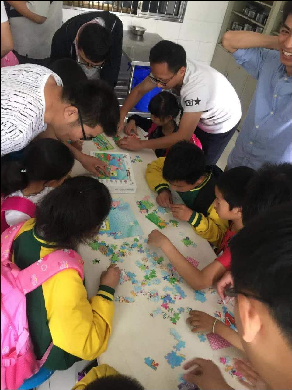 大谷运校园里,通过找伙伴游戏,让留守儿童自己凭借自己手中的标识去找到手拿相同标识的志愿者,相互牵手并领取对方赠送的礼物后,分组进行拼图和萝卜蹲游戏,志愿者在旁指导,参加活动的孩子们热情极高,到处洋溢着欢声笑语。