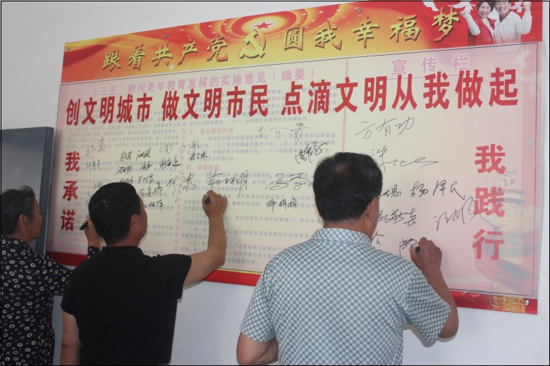会前,还举行了“创文明城市,做文明市民,点滴文明从我做起,我承诺,我践行”签名活动,并向与会人员发放了《倡议书》和《一封信》。全体局机关工作人员和参加会议的老年大学师生140多人在条幅上踊跃签名,表达了大家积极参与“双创”工作的决心。
